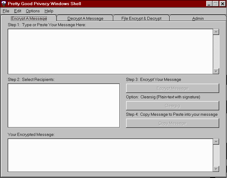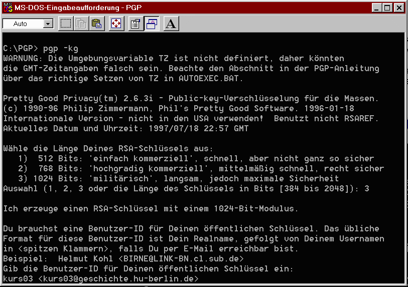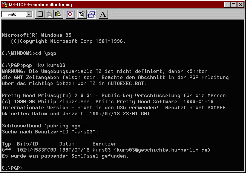 Es gibt inzwischen zwei Versionen von PGP, die Version 2.63 und die Version 5.0. Die Version 2.6.3 ist die am weitesten benutzte und sicherste. es gibt für die relativ neue, und im Übrigen auch kommerzielle 5.0 Version einige Sicherheitsbedenken (vrgl. zB. die Diskussion in den Newsgroups). Wer sich weiter Informieren möchte, kann z.B. mit Yahoo nach PGP-Seiten suchen. Um PGP 2.6.3 zu benutzen, brauche ich folgendes:Eine weitere Auswahl für Windows95 gibt es z.B. hier, oder auf den Seiten, die ich auf der Hauptseite unten aufgelistet habe. Auch die FU Berlin hat einige Software zusammengetragen. Als erstes geht es darum, sich ein