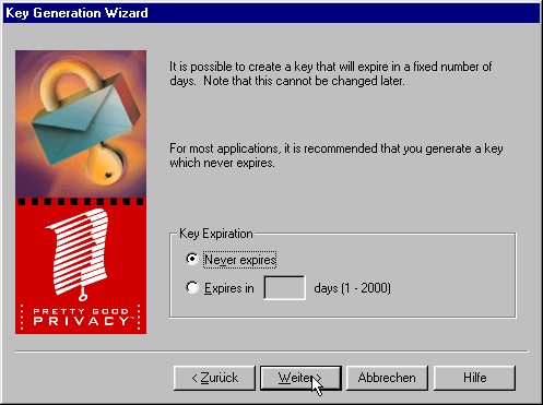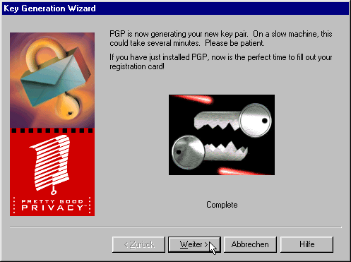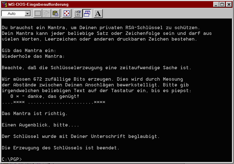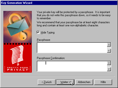 Und dann kommt das Wichtigste: dein Mantra. Das Mantra ist ein geheimer Satz, der deinen Secret-Key schützt. NUR DU SOLLTEST DIESEN SATZ KENNEN! Mit diesem Satz kannstdu später deine Mails entschlüsseln. Wenn du also dein Mantra eingegeben hast, mußt du noch willkürtlich Tasten drücken. Das dient der zufälligen Generierung des Schlüssels.