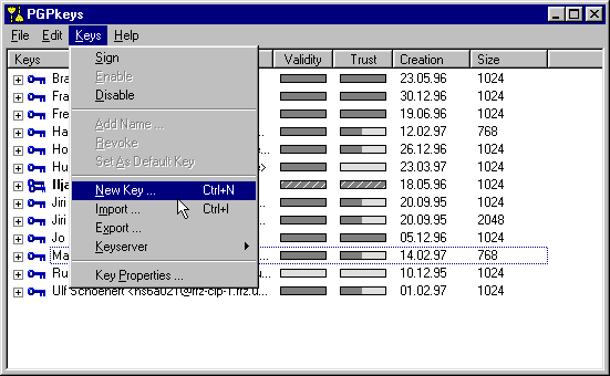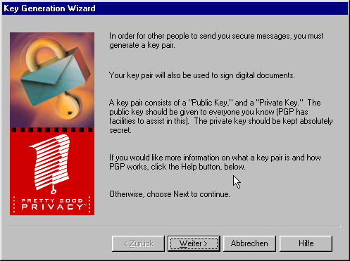 Da du PGP aber wahrscheinlich am häufigsten in E-Mail Programmen verwenden wirst, bieten sich für die 2.6.3 Version sogenannte Plug-Ins an. Das sind Treiber, die sich in das Mailprogramm einsetzen, und eine Schnittstelle zu PGP bieten. Für Eudora gibt es Das PGP-Plug-In PEICS. Du entzipst die Datei einfach in das Eudora Verzeichnis. Dann erscheint beim nächsten Aufruf des Programms oben Rechts ein Schlüssel-Knopf, den du zum verschlüsseln oder entschlüsseln einfach drücken mußt. Peics schlägt dir automatisch den Schlüssel vor, da es die e-mail Adressen in den Schlüsseln mit dem des Senders bzw. des Empfängers vergleicht. Auf diesen Weg kann man ohne große Mühe seine Nachrichten Ent- und Verschlüsseln. Um PGP 5.0 zu benutzen, brauche ich folgendes:Hier ist das Erstellen der Schlüssel durch ein grafische Oberfläche erleichtert, und auch das Verwalten der Schlüssel ist in diesem Programm benutzerfreundlich möglich. Es soll aber Sicherheitslücken im Gegensatz zu der 2.6.3. Version haben. Es geht auch das Gerücht um, die NSA (National Security Agency, dem deutschen BSI entsprechendes Pendant in den Staaten) habe dieses Schlüsselverfahren vollständig oder zumindest teilweise entwickelt, und sich selbst dabei ein Hintertür offengelassen. Nachdem wir das Programm installliert haben, generieren wir automatisch als erstes unseren Schlüssel. Das Programm fragt uns, ob wir bestehende Schlüüsel haben. Wir können auch weiterhin den 2.6.3 Schlüssel benutzen. Umgekehrt ist dies nicht möglich, die 2.6.3 Version erkennt den 5.0 Schhlüssel nicht.
