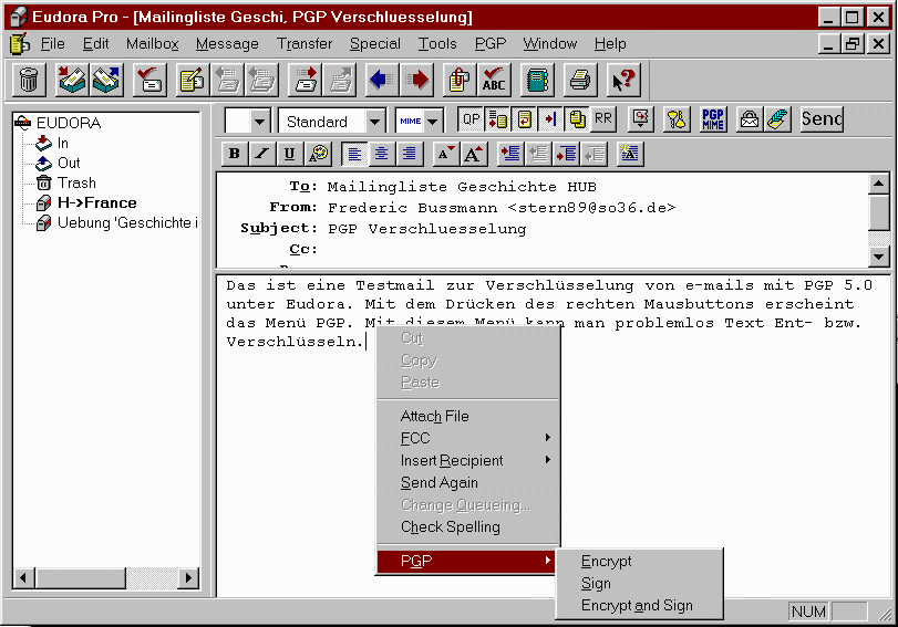 Die PGP 5.0 Version fügt sich automatisch beim Start von Windows95 in das Dateimenü der Anwendungen ein (z.B. beim Explorer). Praktisch ist hier wieder die Benutzung mit einem Mailprogramm wie Eudora, es geht aber auch mit anderen Programmen. Bei Eudora kann eine verschlüsselter Text durch Klicken des rechten Mausbutton unter dem Menüpunkt PGP/Decrypt problemlos entschlüsselt werden.