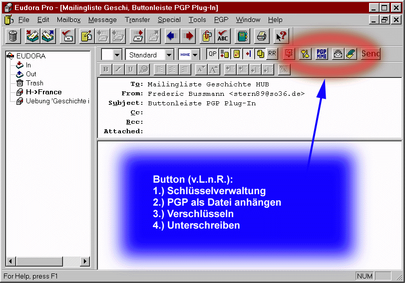 Mit PGP 5.0 ist ein sehr Benutzerfreundliches Verschlüsselungsprogramm 'auf dem Markt', was sich gut ein Mailprogramm integriert, und so hoffentlich, die Verwendung von PGP erhöht. Leider ist die Sicherheit dieser Version nicht nicht eindeutig geklärt, sodaß ich jedem empfehlen würde, erst mal mit der 2.6.3 Version zu arbeiten. ... zur¨ck zur Hauptseite