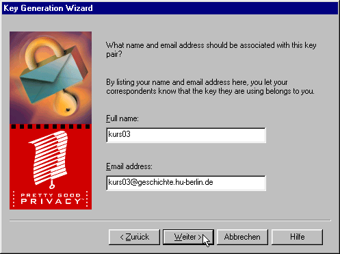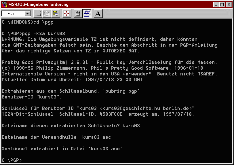 Wenn du z.B. für den kurs03 den öfffentlichen Schlüssel extrahieren willst, mußt du 'pgp -kxa kurs03' eingeben. Der Schlüssel wird dann in eine Datei gelegt, die du dann bestimmen mußt, z.B. 'kurs03'.