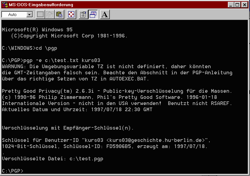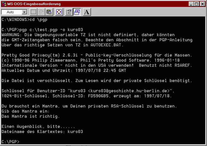 3. Diesen Text verschickst Du z.B. als e-mail an den Kurs03. 4. Zum Entschlüsseln des Textes mußt du als Empfänger folgendes machen: Angenommen du bist der Inhaber des Secret Key 'kurs03', der sich im Geheimschlüsselbund 'secring.pgp' befindet. Der verschlüsselte Text befindet sich in der Datei 'test.pgp'. Dann kannst du mit dem Befehl 'pgp c:\test.pgp -o kurs03' den Text entschlüsseln. Dein Secret Key verlangt zuerst noch nach deinem Mantra, deinem Geheimsatz. Wenn es richitg ist, legt es den entschlüsselten Text in die Datei 'kurs03', den du dir mit einem Editor einfach wieder durchlesen kannst.