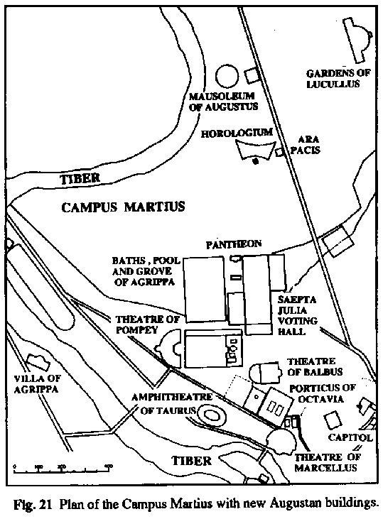 | 1. Einleitung 2.1. Rom im letzten Jahrhundert vor Christus - eine kurze Beschreibung 2.2. Pompeijus - Cäsar - die Republik unter Octavian 2.3. Die Baupolitik unter Augustus 3. Das Marsfeld 3.1. Das Mausoleum 3.2. Die Sonnenuhr 3.3. Der Friedensaltar 4. Zusammenfassung: Machtvorstellung und -ausdruck in den Bauten Roms Literaturhinweise
